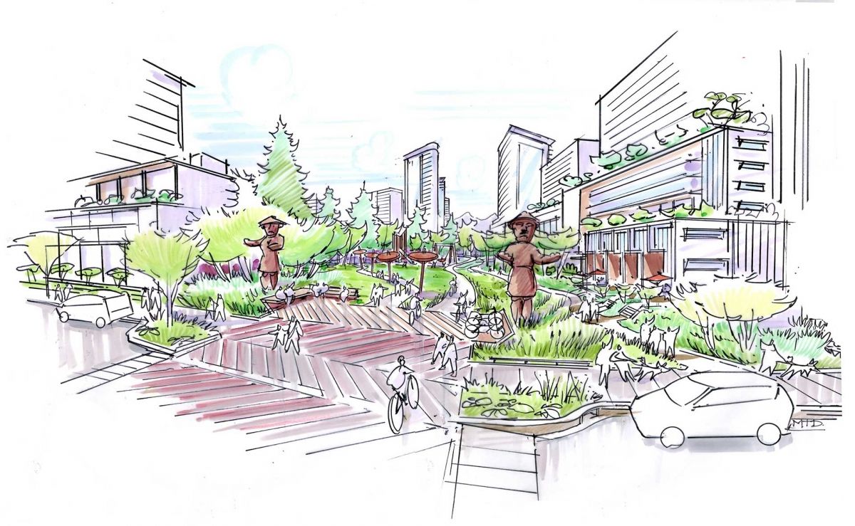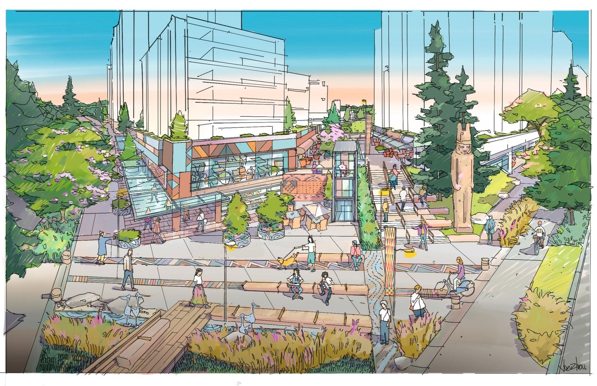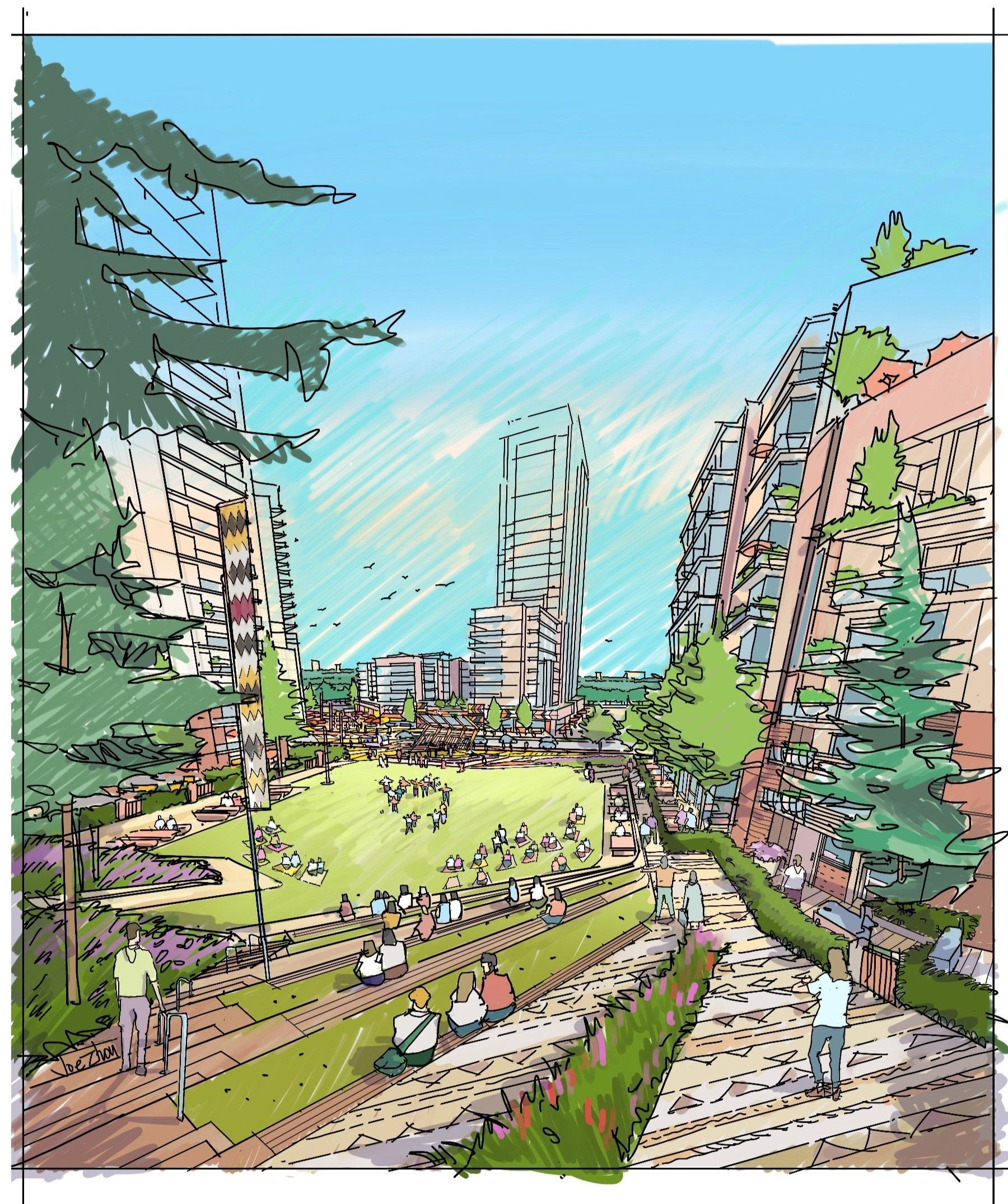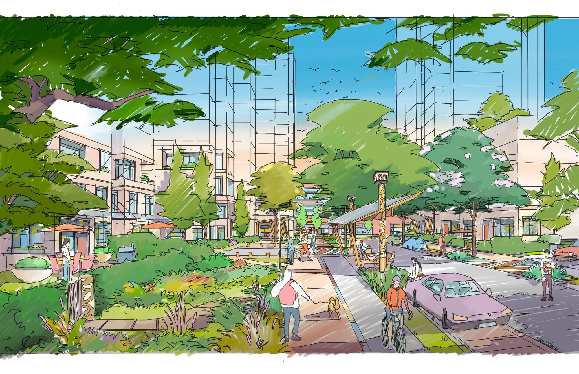 The moderate-density, mixed-use community will consist of 17 towers-equalling 5,239 units-of housing including leasehold strata, market rental, moderate income rental, and affordable rental tenures, along with 135,00 square feet of commercial real estate space, all being offered in a variety of sizes. Inspired by connectivity, an Indigenous philosophy and way of being, the plan will include a network of walkable streets, paths, and trails, including the revitalization of Sumner Creek.