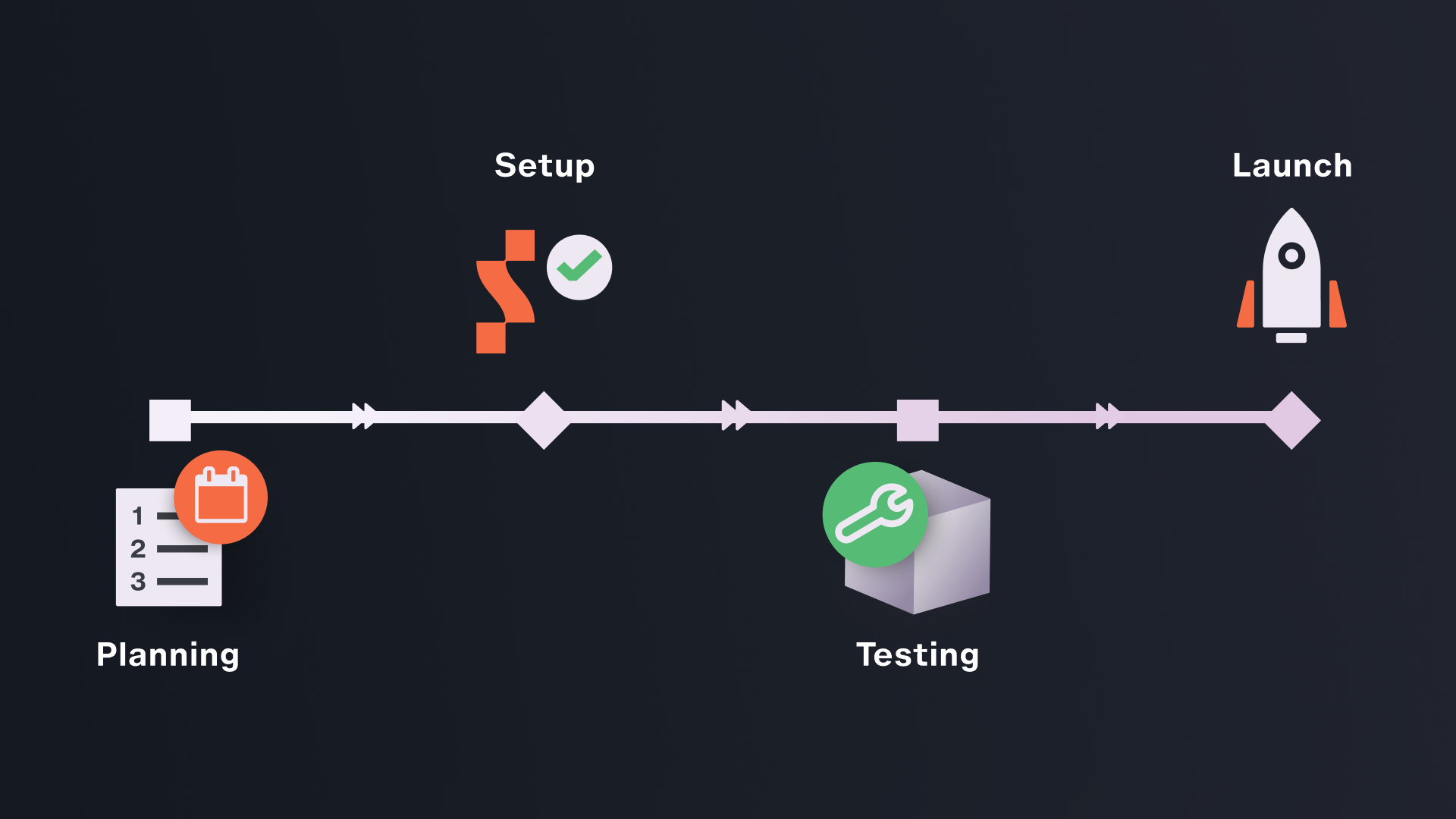 Launches can take several weeks of steady work. This includes covering crucial steps such as internal setup, tool configuration, and testing before going live. This is also the time to identify outside risks like market shifts that can impact your launch, and planning ways to mitigate them. Mapping out your timeline can be broken down into three key points: