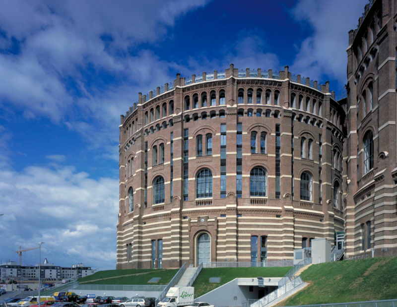 Built between 1896 and 1899 The Vienna Gasometers were disguised as buildings at a time when society was reluctant to freely exhibit industrial infrastructure. Made of brick and featuring attractive decorative details and arched windows, each of the four structures measures 62 meters in diameter and 72 meters in height.