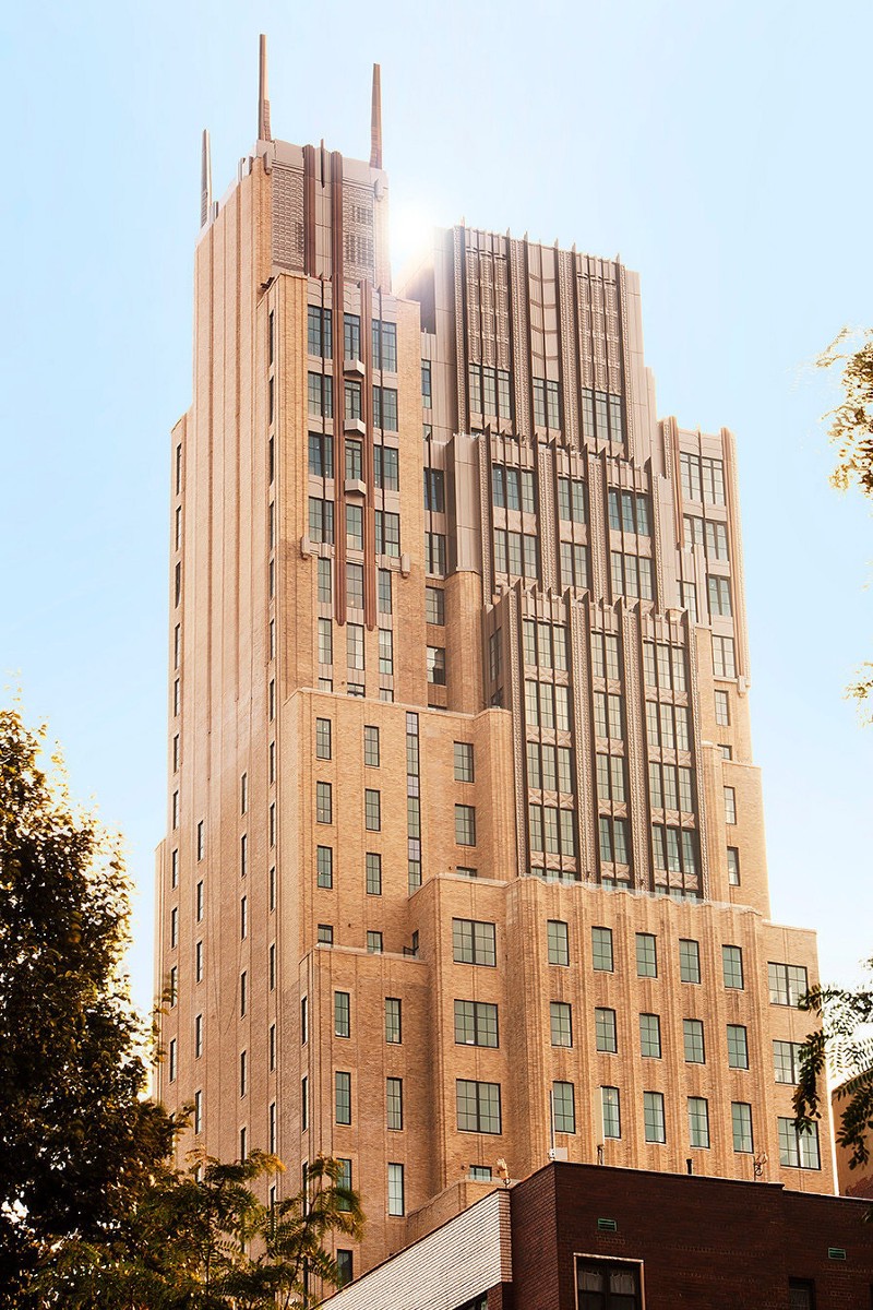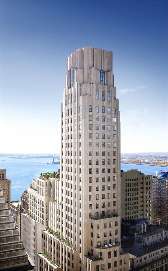 Walker designed the 654-foot-tall Art Deco tower to create an undulating effect as sunlight hits the carved limestone drapery. As the tower tapers, the setbacks allow for private terraces in 47 units. The former executive lounge on the 52nd-floor features a scalloped mother-of-pearl ceiling that will be showcased by a triplex penthouse that also features rooftop access.