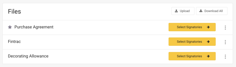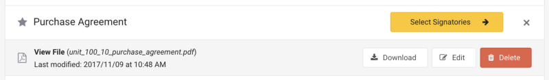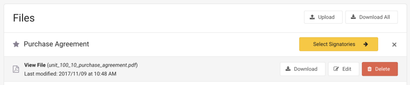 Everything you need to manage your contract files can now be found in the Files section on a contract. Click on any of the files to see more details about the file and the status of any signatories. The star in the top left indicates that file is the primary sales agreement (primary lease agreement on leased units). You’ll also notice a lot of new options in this section, such as uploading and downloading, which are outlined further below.