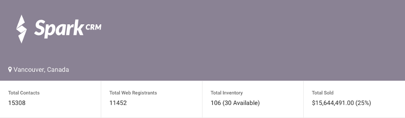 At the top of the portfolio page you will see statistics with values combined from all your projects. This includes contact, registrant and inventory data. You can also start to customize Spark by adding your company’s brand colour and logo.
