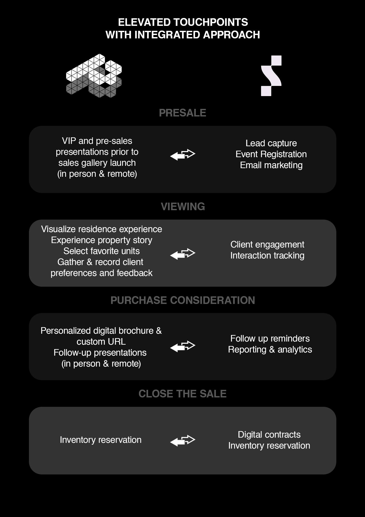 Inventory Management - Both inventory and property listings can be managed directly from the integrated platform. Visualization tools provide buyers with unique first-person perspective so they are able to experience life as a resident including views, 3D walkthroughs of the unit and amenities, materials, color schemes and so much more.
