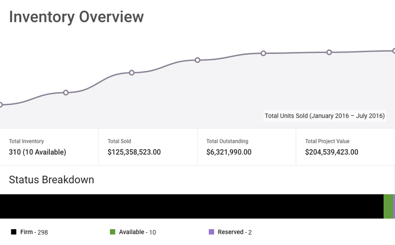 The statistics underneath show the total number of units, value sold, value outstanding, and value of your project. Below that, the new status breakdown shows the current state of your project at a glance. The “Inventory Statistics” widget shows percentage of inventory sold, average unit price and average price square foot. To the right, the “My Inventory” widget shows the five most recent units that you’re assigned to.