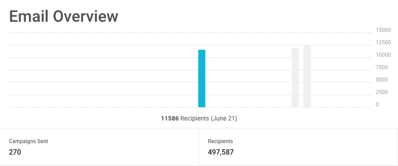 The total number of campaigns and recipients for your project are shown just below the graph. At the bottom of the page, “Recent Campaigns” shows the last five campaigns you have sent. In this list, you will see how many people each campaign was sent to, as well as the open rate. Click through to see more statistics about individual campaigns.