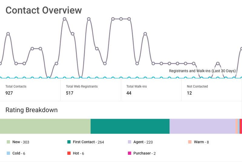 You’ll also see a box with the number of contacts that no one has interacted with. Use this to make sure you’re following up with everyone that registers with your project. Below, the rating breakdown visualizes where your contacts sit in the pipeline. “This Week’s Activity” measures your project’s performance in comparison to the previous week. Your sales team’s average response time is shown to ensure registrants are quickly engaged. The last widget, “My Contacts”, shows the five most recent contacts that are assigned to you. You can interact with them from this page, or click “View All” to access the complete list.