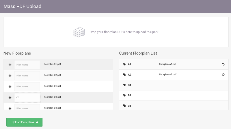 If a project has many different floorplans, it can be a little arduous to add the files one at a time. Our new mass uploader allows you to drag in as many PDF files as you want, and you can either assign them to an existing plan (which may or may not have a file attached currently), or you can create new plans by giving each uploaded file a name. Find this under Inventory > Floorplans.