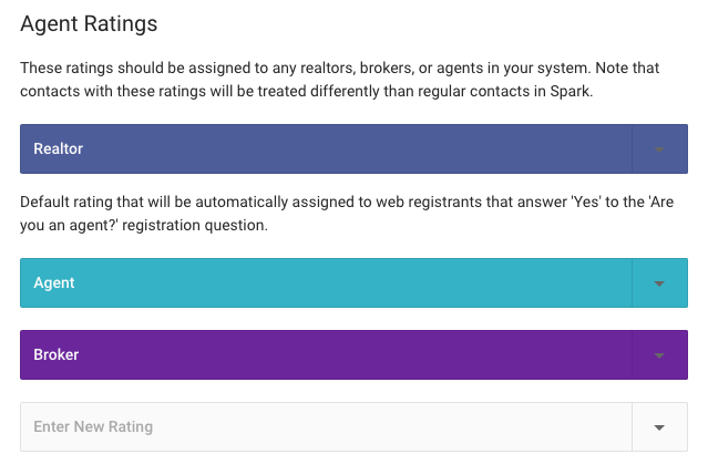 You can now specify multiple agent/realtor/broker ratings in Spark. You will still have one default that will automatically be assigned to contacts that answer “Yes” to the “Are you a realtor?” form question, but from there, you can segment your list of agents into as many different categories as you like, and they will all have the unique properties of an agent in Spark.