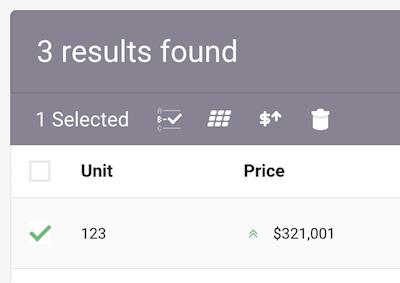 Mass actions have always been available on the inventory list, but now you can also use them from inventory search results. This allows you to search a group of units and update statuses, prices, assign floor plans, or remove them.
