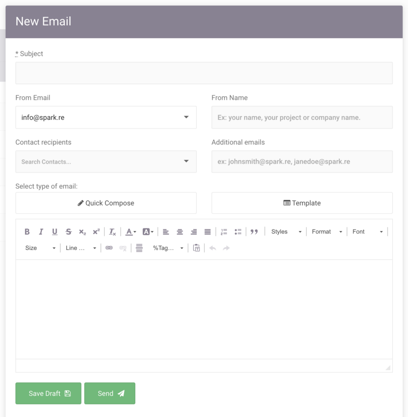 Quick emails now open in a modal rather than taking you to a new page. You can now send someone an email without losing your place in Spark. This is great for working through a list of leads or sending a deposit reminder from a contract without ever leaving the page.