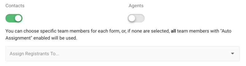 There is now a separate toggle to choose if you would like to include agents in the auto-assignment process. This means you can evenly distribute newly registered leads to your sales team without automatically assigning agents to your team. You can also now choose specific team members to receive new leads based on the registration form, allowing different team members to have their own dedicated forms.