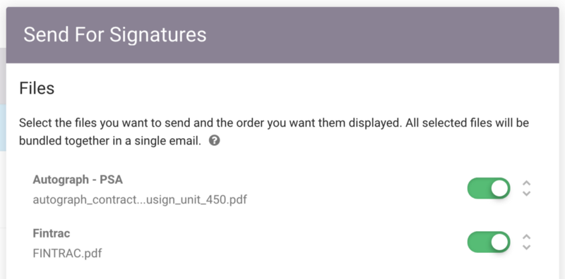 Often contracts involve a few separate files that need signed. Previously you had to send these all individually meaning your clients would get a lot of emails. Now you can select all the files that need to be signed, order them, and send them all bundled together in one email.