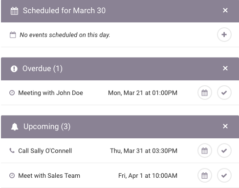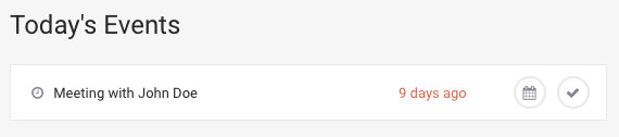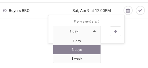 Fortunately, we’ve also added some new actions to make this process easy to manage. To complete an event, just click the check mark on the far right of the event row. Or, if you haven’t completed it, you can also take advantage of our quick ‘Reschedule’ option (the calendar icon) to move the event forward by 1 day, 3 days or 1 week. Of course, if you want to reschedule to a more specific date and time, you can always click on the title to go to the event page and edit it in full.