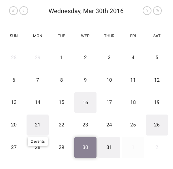 On the right, we now display a full-month calendar view. Days with scheduled events are highlighted in light purple, with the current day in darker purple, and you can hover over each of these to see how many events are scheduled for that day. In addition to clicking on each day in the calendar to navigate to that day’s schedule, you can also use the arrows in the calendar header to quickly switch between days and months.