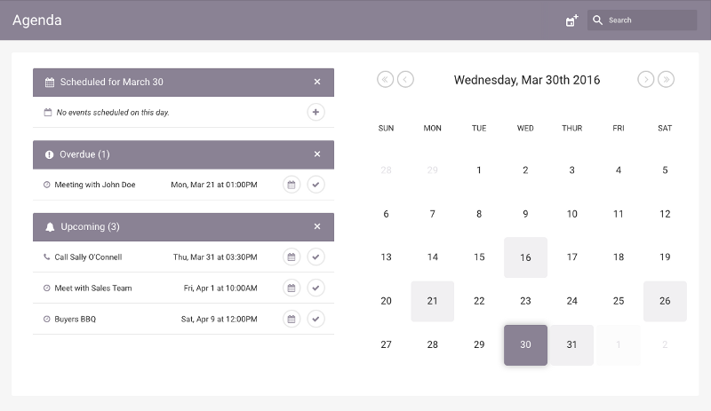 On the left (or top, for smaller screens), you will see up to three lists. The first will be events scheduled on the selected date, or found events, if you have entered a search. The second and final lists will contain any overdue or upcoming events, if available. Click the ‘x’ in the purple header on any of these lists to collapse them and focus only on what you need to see.