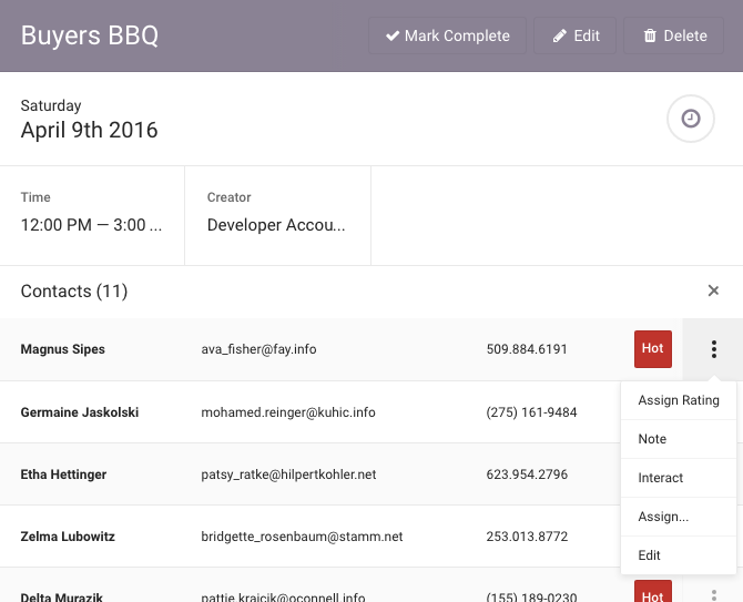 - If you’ve attached contacts to an event, you can interact with them directly from the event page by using the micro menu in the dropdown list (see image below).