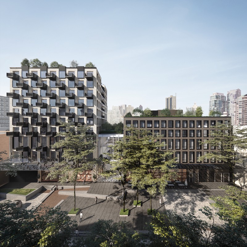 Designed by Henriquez Partners Architects, Blood Alley is comprised of 62 market and 80 non-market 1 and 2 bedroom rental homes, an underground restaurant/lounge space, retail and a public plaza.